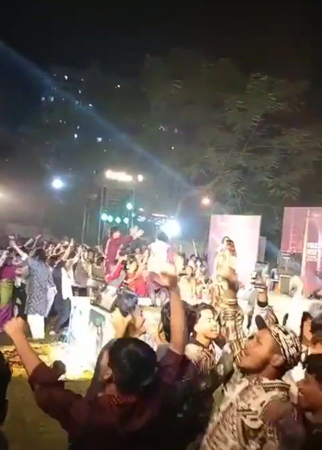 crowd of people dancing at an outdoor event at night. There is a stage with performers dressed in traditional Indian clothing. The crowd is made up of people of all ages, and they are all dancing and cheering. Some people are holding up their phones to record the event. There are lights and speakers on the stage, and the sound of music can be heard. The event appears to be a celebration or a festival. There are trees and buildings in the background.