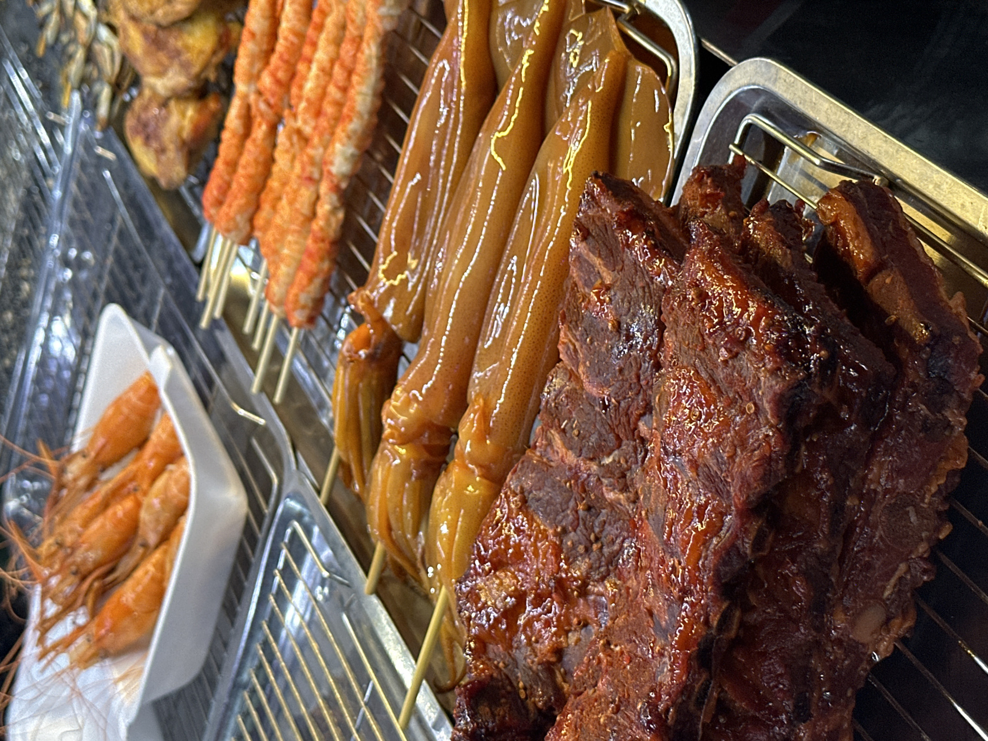 display of street food in Pattaya City, Thailand. There are several types of cooked items arranged in metal trays with grates. From left to right, there is a white tray containing cooked shrimp, followed by trays of skewered crab sticks, skewered squid, and glazed ribs. The items are positioned on a metal rack, likely for sale.
