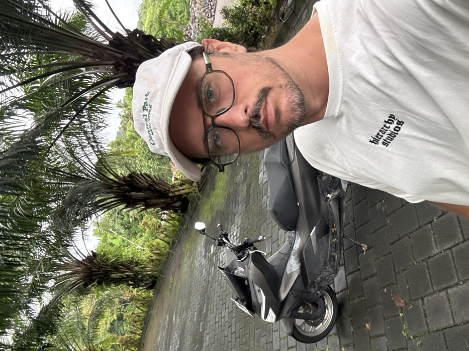 An outdoor scene captured in Munggu, Indonesia, features a male subject in the foreground, partially visible from the chest up, taking a selfie. He wears a light-colored baseball cap with "Central Park New York" embroidered on the front, dark-rimmed glasses, and a white t-shirt featuring "hierarchy studios" text. The subject has a mustache and short facial hair, looking directly at the camera. Behind the subject, to his left, a dark grey or black maxi-scooter is parked on a surface composed of dark grey interlocking pavers. The ground appears damp. In the background, lush green tropical vegetation is visible, including several large palm trees with thick trunks and frond-like leaves. A dense canopy of trees stretches across the horizon under an overcast sky, suggesting a cloudy day. The terrain behind the paved area appears to rise slightly.