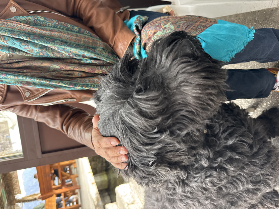 The image depicts a close-up scene in Dražin Vrt, Montenegro, featuring a person and a dog in an outdoor or semi-outdoor setting. A person, observed from the chest down, wears a brown leather jacket, a multi-patterned scarf primarily in teal, brown, and gold tones, and dark blue jeans. Their right hand, with visible fingers and short nails, rests on the head of a medium to large-sized dog. The dog possesses dense, curly, dark grey to black fur with lighter grey strands, and its head is turned away from the camera, facing right. In the blurred background, several wooden tables and benches of an eatery are visible, with two indistinct human figures seated at one table. Below these tables, a body of water is present, alongside a light-colored concrete or stone edge. The ground beneath the subjects is a light-colored paved surface, and a white railing or structure is visible on the far right. Natural light illuminates the scene.