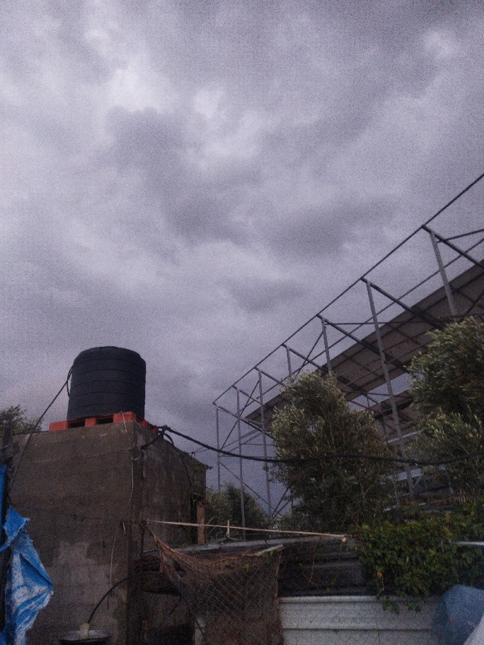 The image depicts an outdoor scene in Khan Yunis, Palestinian Territory, under an overcast, grey sky. A dark cylindrical water tank, supported by red pallets, sits atop a weathered concrete block structure in the mid-ground left. Black utility piping and electrical lines are affixed to this structure and extend across the frame. To the right, a prominent, angled metal framework, consistent with a support for solar panels or a large sign, rises above a dense cluster of olive trees and other green vegetation. The lower-left foreground shows a partially visible blue tarp, while a section of brown netting is draped in the lower-center foreground. No individuals are visible.