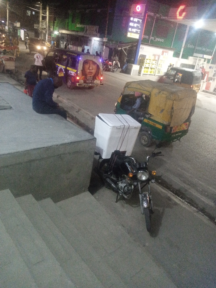 At night, a man sits on a concrete ledge overlooking a street scene. A motorcycle with a white insulated box strapped to its back is parked nearby. A colorful minibus featuring a portrait on the back drives down the road, alongside a green and yellow auto-rickshaw. In the background, a brightly lit gas station advertises fuel prices and promotes mobile money services. Other vehicles and pedestrians are visible in the dimly lit surrounding area.