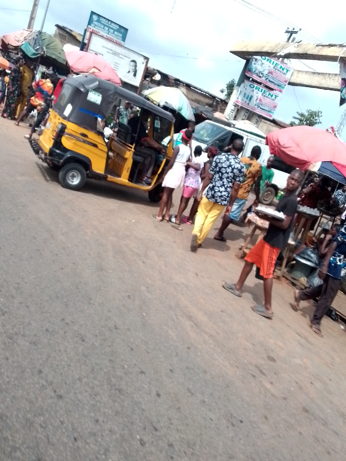 The image captures a busy street scene in the city of Unknown, Unknown, under an overcast sky. An asphalt road, showing wear, occupies the foreground and mid-ground. A yellow three-wheeled motorized rickshaw, with occupants inside, is positioned on the road, angled slightly right. To the left of the rickshaw, several individuals, including women and children, are visible near market stalls with umbrellas. On the right side of the road, a young man in a black t-shirt and orange shorts walks towards the viewer, carrying a tray with white items. Other pedestrians, including a man in a black floral shirt and yellow pants, move through the scene. Market stalls with various goods and red and green umbrellas line both sides of the road. In the background, buildings are visible, along with signage including "CHURCH OF NIGERIA" and "ORIENT SPECIAL" banners. A white van is partially obscured behind the rickshaw. Numerous people are present, indicating a commercial or residential thoroughfare with ongoing pedestrian and vehicular activity.