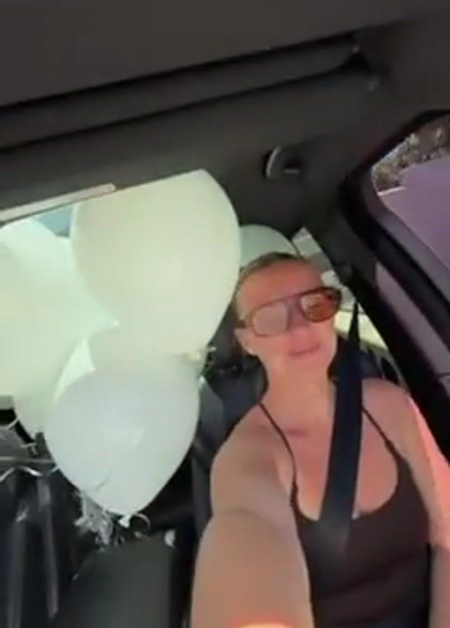 A woman in a black tank top and sunglasses is driving a car filled with white balloons. She is smiling and looking at the camera. The car is driving down a street lined with palm trees. There are other cars parked on the side of the road. The sky is blue.