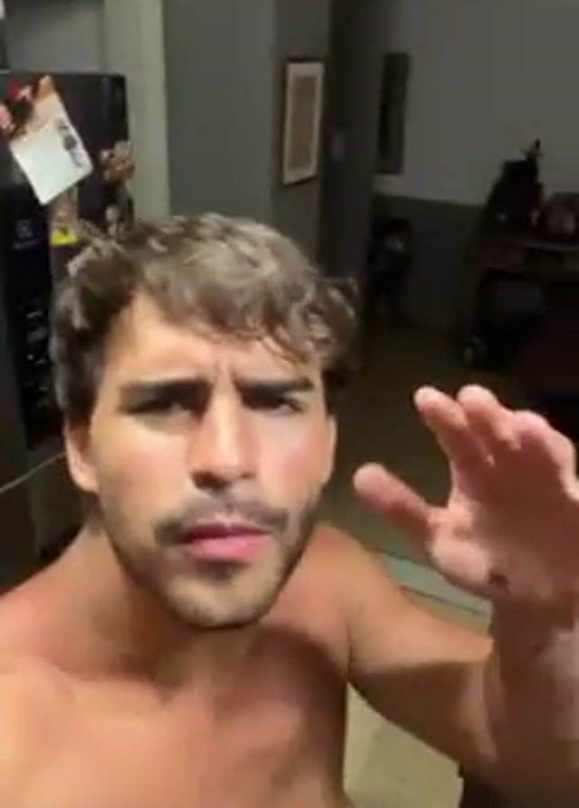 shirtless man with brown hair with blonde highlights and a short beard speaking directly into the camera. The camera angle is slightly upward, giving a close-up view of his face. He appears to be standing in a kitchen or living area. Behind him, a refrigerator and part of a dining table are visible. The background is slightly blurred, but one can see details like wall paint, a glass container, and general clutter on the table. He appears to be singing or speaking with emotion as his facial expression changes.