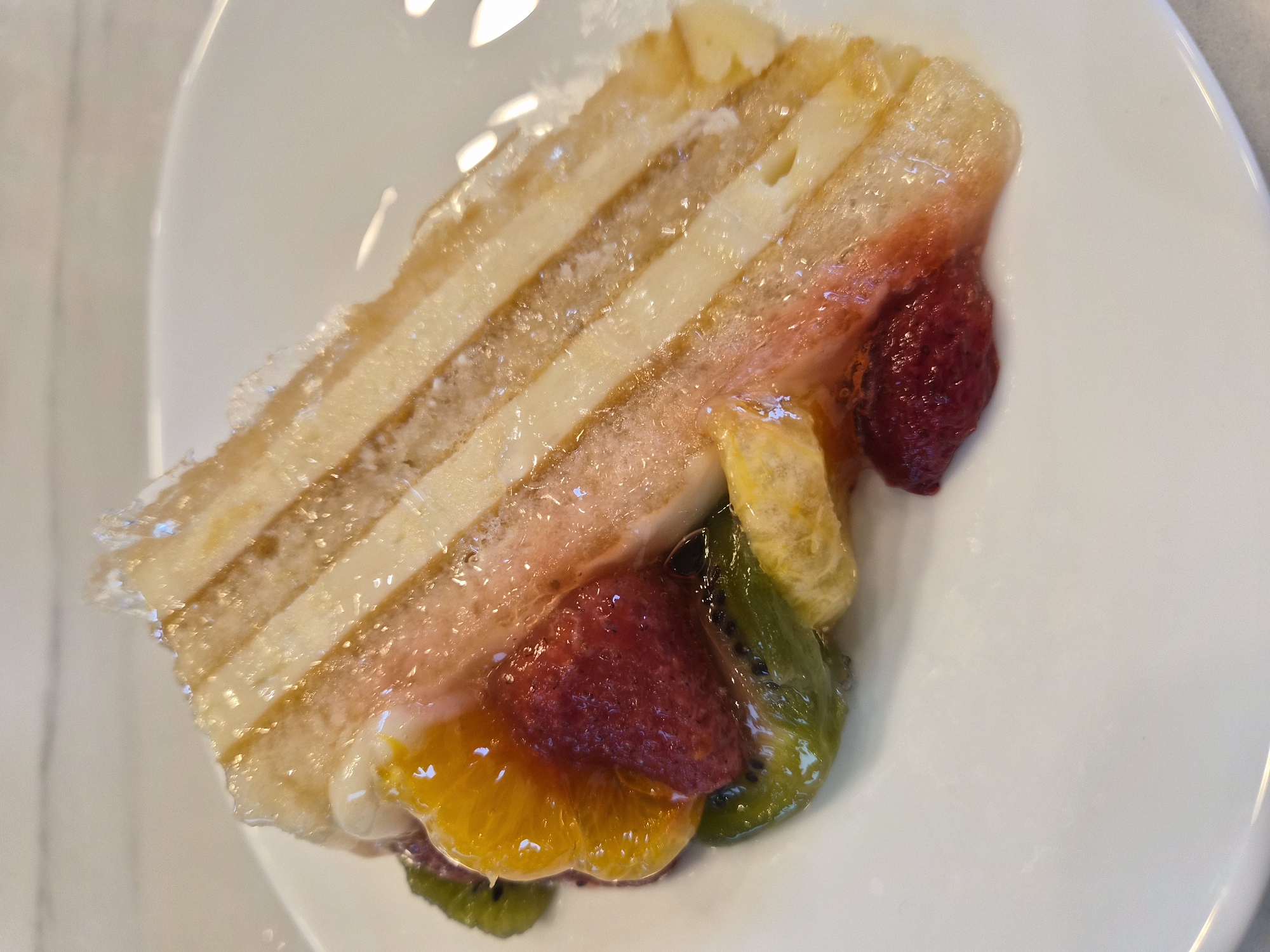 A single slice of a multi-layered cake is presented on a plain white, round ceramic plate. The cake consists of approximately three to four horizontal layers of light-colored cake, alternating with thick, opaque, off-white layers of cream or frosting. The exposed top and side edges of the cake slice are garnished with an assortment of cut fruits, specifically bright green kiwi slices containing black seeds, segments of orange citrus, and irregular pieces of red strawberry. These fruits are coated and partially suspended within a thick, clear, and highly reflective gelatinous glaze. The plate rests on an indistinct, light-toned, and textured surface, suggesting an indoor setting. This observation is recorded in Plovdiv, Bulgaria.