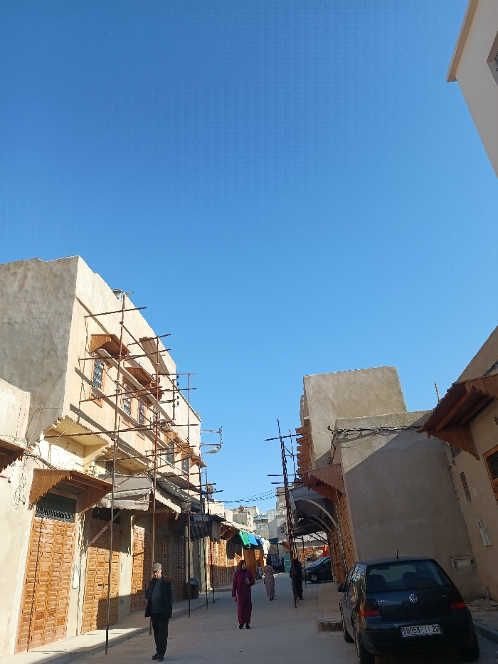 The image captures a narrow, sunlit street within an urban area of Meknes, Morocco