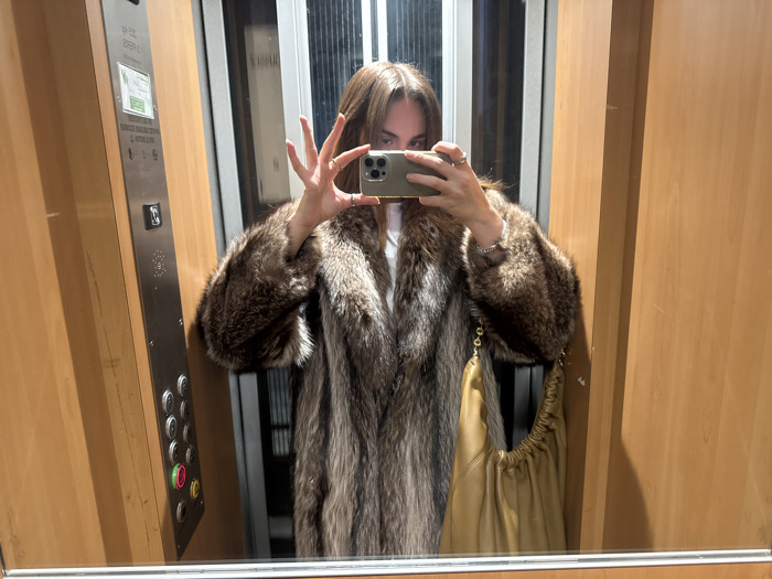 A woman is depicted taking a mirror selfie inside an elevator. The elevator interior features light brown wooden wall panels and a brushed metal control panel on the left side. The control panel displays a green illuminated button among other circular floor selection buttons, and a label with text including "R-DC-2" and "PARIS," confirming the location as Paris, France. The woman has shoulder-length brown hair and is wearing a voluminous, multi-toned brown fur coat over a white top. A large, gathered tan leather handbag with a gold chain strap hangs from her left shoulder. She holds a smartphone horizontally with both hands to capture the image, with her right hand positioned in a splayed-finger gesture. A silver bracelet is visible on her left wrist. Her face is largely obscured by the smartphone.