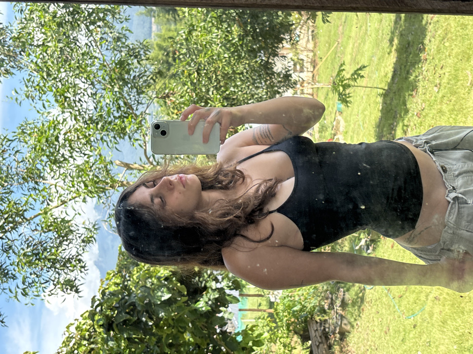 A woman is reflected in a mirror, taking a selfie with a white phone. She wears a black tank top and grey shorts. The outdoor setting features lush greenery, including trees and grass, creating a vibrant background. The sky is partly visible through the trees. The mirror's surface has some imperfections, possibly dust or smudges.