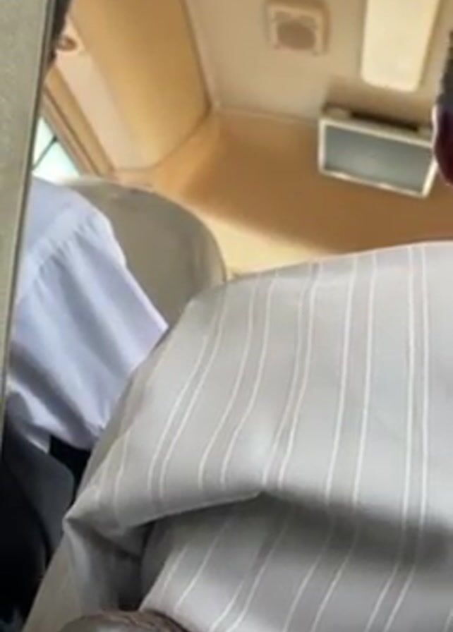 The video is taken from inside a moving vehicle, focusing on the back of the heads of two people. The person in the foreground is wearing a gray and white striped shirt and has short, dark hair. The person to their left is wearing a white shirt and black pants. The interior of the vehicle is beige, and there are vents and lights visible on the ceiling. The camera is steady, and the focus is on the clothing of the people.