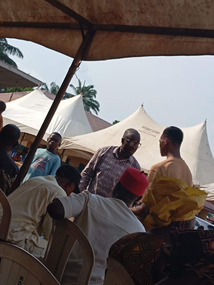 Under a weathered awning, a group of people gathers, possibly for an event. A man in a checkered shirt and glasses speaks to another in a tan shirt carrying a yellow bag. Others sit in chairs, including one man with a red fez. White tents loom in the background. The scene appears to be outdoors on a bright day.