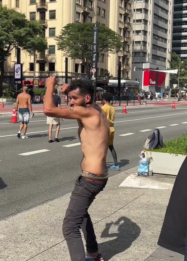 people enjoying a party on a city street. In the foreground, a shirtless man dances enthusiastically on the sidewalk, near an open tent setup, and other people are dancing in the street behind him. Some people gather under the tent, including someone in a Stitch costume holding a drink. Tall buildings line the street on both sides, and there is traffic on the crosswalk. The weather is sunny.