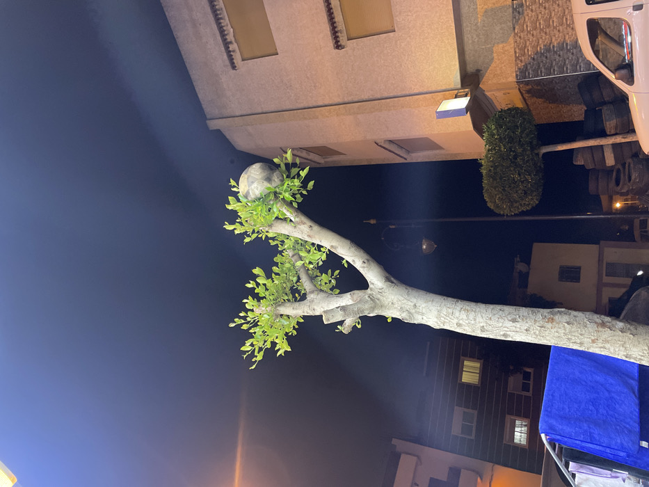 A tree with light green leaves holds a patterned ball at the end of a branch against a dark blue sky. Behind, buildings with lit windows and a streetlight can be seen. A light-colored building and rounded bush sit on the right. A portion of a white vehicle with tires stacked above the cab also occupies the right side. A blue object partially obscures the bottom right corner.
