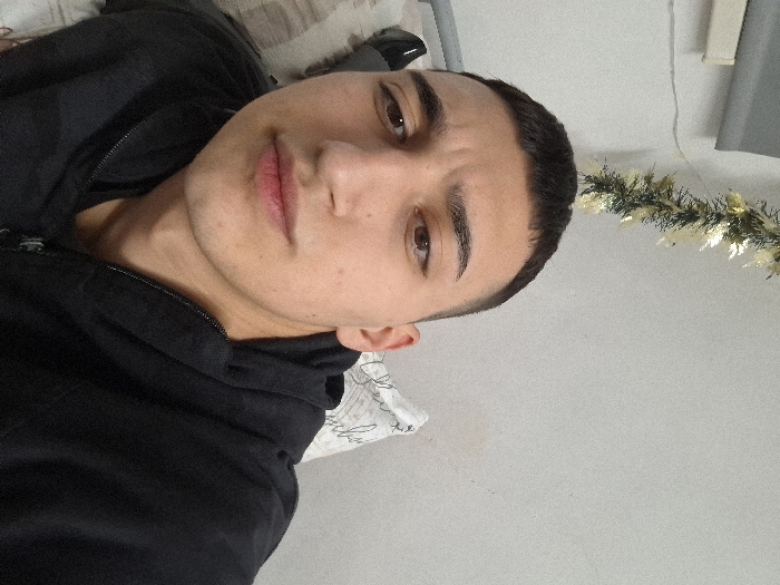 A young male individual, appearing to be in his late teens or early twenties, is depicted in a close-up, frontal self-portrait