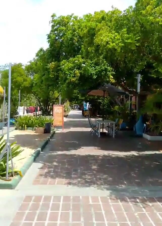 paved walkway lined with trees, plants and a few tables with umbrellas. The walkway leads to a beach with white sand and calm, blue water. There is a small hill in the background.