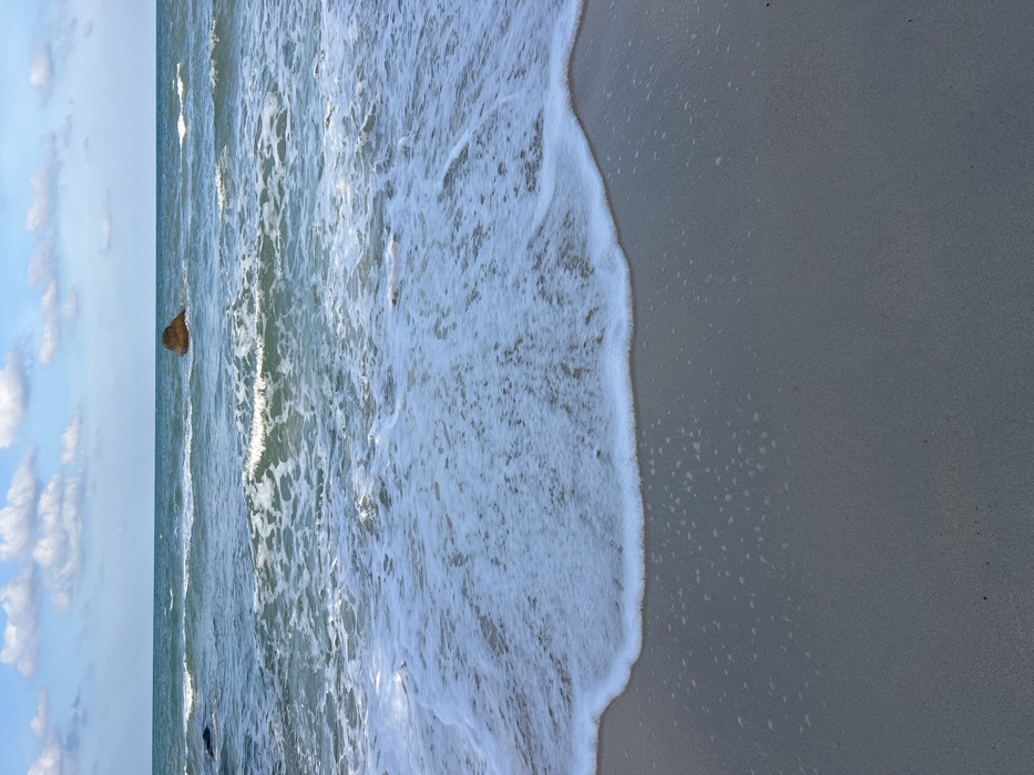 The image displays a coastal scene at Baan Chaweng Noi, Thailand. The foreground consists of light beige sand, wet at the immediate edge due to receding ocean waves, showing small foam bubbles. The midground is dominated by the light blue-green ocean water, agitated with numerous white foamy waves breaking and extending towards the shore. In the deeper background water, a large, dark brown boulder is visible towards the right side of the frame. A smaller, dark object is partially submerged on the far left. The sky above is light blue with scattered white cumulus clouds. No individuals or man-made structures are present in the observable area.