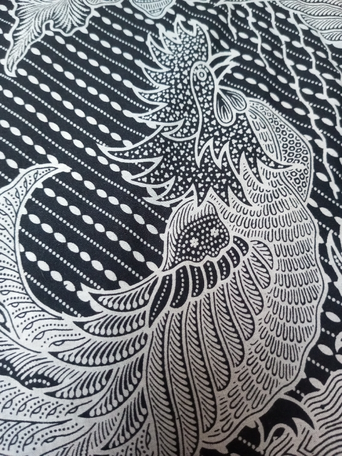 The image displays a black and white textile pattern. A stylized rooster dominates the design, its form outlined in white against a black backdrop. Its feathers feature intricate details. A dotted pattern in diagonal rows fills the black spaces. Overall, the pattern showcases a mix of organic and geometric elements, creating a visually captivating piece.