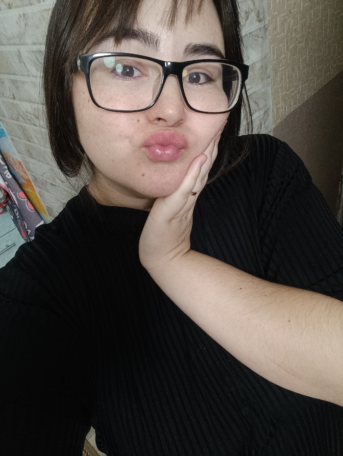 A woman with dark hair and bangs wears large, black-framed glasses. She has fair skin with freckles and is pursing her lips in a kissing expression. Her right hand is gently placed on her cheek. She wears a black, textured top. The background features a neutral-toned, textured wall on the right and a glimpse of a colorful object on the left.