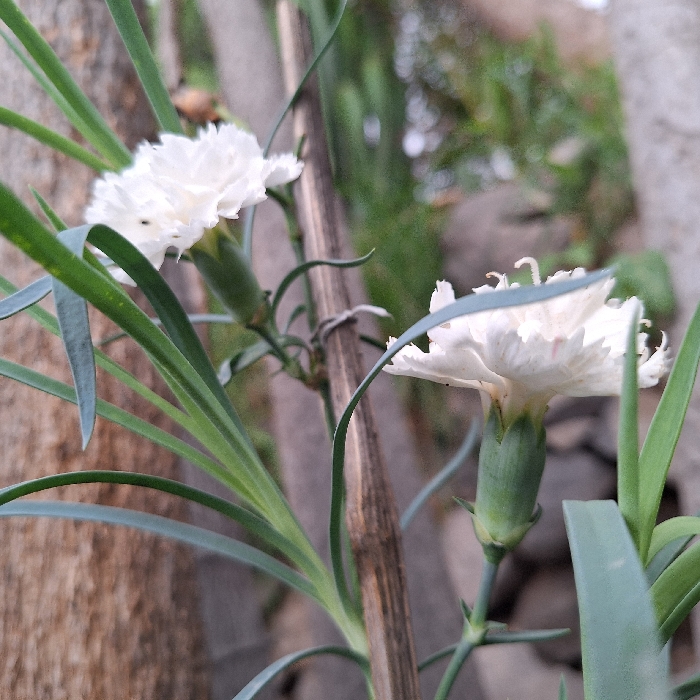 Two white carnations are in focus, their delicate petals fringed and unfurling. They grow from slender, green stalks alongside elongated, grayish-green leaves. A thin, bamboo-like stick runs vertically, providing support and blurring slightly into the background. Soft, muted colors and natural light create a serene, outdoor setting, with indistinct greenery and stonework hinting at a garden environment.