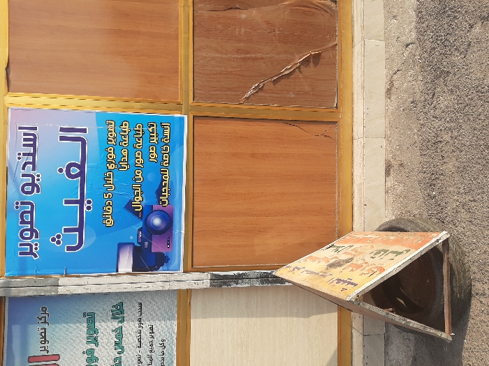 This image depicts an outdoor commercial scene during daylight hours in Al-Qadam Municipality, Syria. The building facade on the left features a light-colored section with partial Arabic text visible, indicating a "Photo Center." Adjacent to this, a dominant blue banner advertises "Al-Faily Photo Studio" in Arabic, listing services that include "Instant photography in 5 minutes," "Printing photos from mobile," "Photo enlargement," and "Special lady for veiled women," accompanied by a graphic of a camera. Below the blue banner and extending to the right, a series of brown, wood-patterned panels framed by yellowish trim show signs of wear, including a distinct crack in one panel and peeling on another. These panels rest on a light-colored tiled curb. The ground directly in front of the building is unpaved, consisting of loose gravel and dirt. In the lower-left foreground, a roughly constructed A-frame sign, displaying faded printed content, is stabilized by a black rubber tire lying flat on the ground. No individuals are present in the scene, and no specific actions or interactions are depicted.
