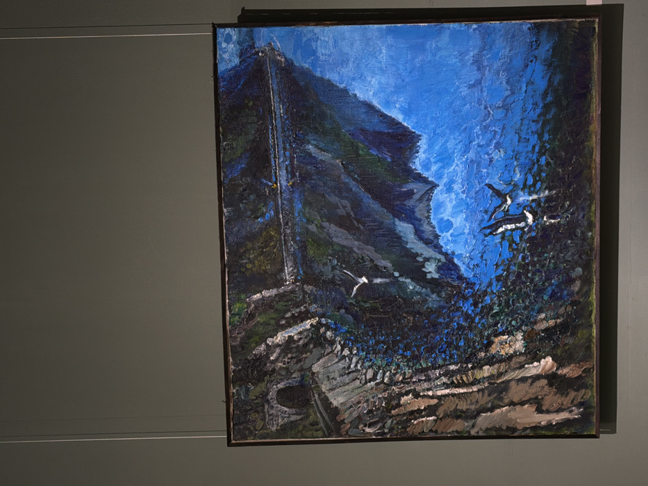 An oil painting, framed in dark brown, hangs suspended by two thin wires against a plain, light olive-green wall in a gallery or exhibition space in Irkutsk, Russia. The painting, rendered with noticeable impasto brushstrokes, depicts a rugged natural landscape dominated by deep blues, greens, and browns. On the left, a steep, verdant cliff face descends to a body of water. A dark, arched tunnel entrance is visible on the cliff towards the upper left, with a narrow track or path running alongside the water and into the tunnel. The central and right portions of the artwork feature a wide expanse of water, reflecting a large, dark mountain range and a bright blue sky, creating an inverted mirror image. Three birds are depicted in flight over the water: one smaller, white bird higher up, and two larger, dark birds with white undersides closer to the foreground. No individuals are present in the photographic frame.