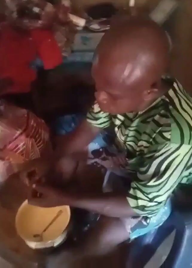 Here is a detailed description of the video: The video shows a man with a shaved head sitting on a blue plastic chair, indoors, and eating. He is wearing a green and black striped shirt. He is holding food in his hands and putting it in his mouth. There is a yellow bowl with a spoon next to him on the floor. In the background, there is a small table with a clock on it, some clothing, and other miscellaneous items. The room appears to be simple, with plain walls. The camera is positioned slightly above the man, providing a clear view of his actions. The lighting is natural. The man appears focused on eating.