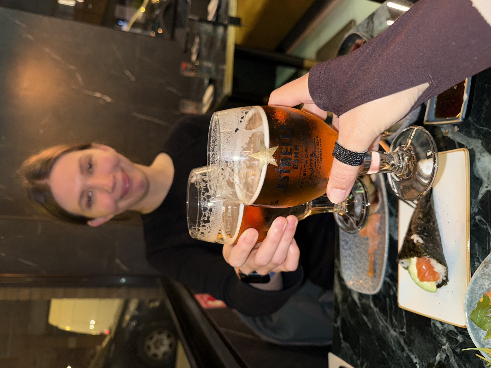 The image displays two individuals toasting with beer glasses inside a restaurant or bar in Barcelona, Spain, identifiable by the "Estrella Damm" beer brand prominently featured on one glass. The scene is illuminated by artificial light, indicating nighttime. In the immediate foreground, a right hand, wearing a dark beaded ring on the ring finger and a dark brown long-sleeved top with a thumbhole, holds a tulip-shaped glass of Estrella Damm beer, filled with an amber liquid and a foamy head. This glass is clinking with a second, identical beer glass held by the left hand of a female in the mid-ground. The second glass displays "CRISAL CEM25 0866" embossed on its side. The female is smiling and looking towards the camera, her light brown hair pulled back. She wears a dark long-sleeved top, and a smartwatch is visible on her left wrist. They are seated at a dark table with white veining, possibly marble. On the table, a rectangular white plate presents a temaki sushi roll containing rice, salmon, and avocado, wrapped in nori. A small, square dish holds dark liquid, likely soy sauce. A blue/grey patterned plate in the background contains what appears to be pickled ginger. A partial view of another blue/grey bowl with green leafy contents is visible in the bottom-left corner. The background consists of dark, likely paneled or textured walls. Through a large window on the left, an out-of-focus street scene is visible, including a white van, a dark vehicle, and blurred streetlights, characteristic of an urban environment at night.