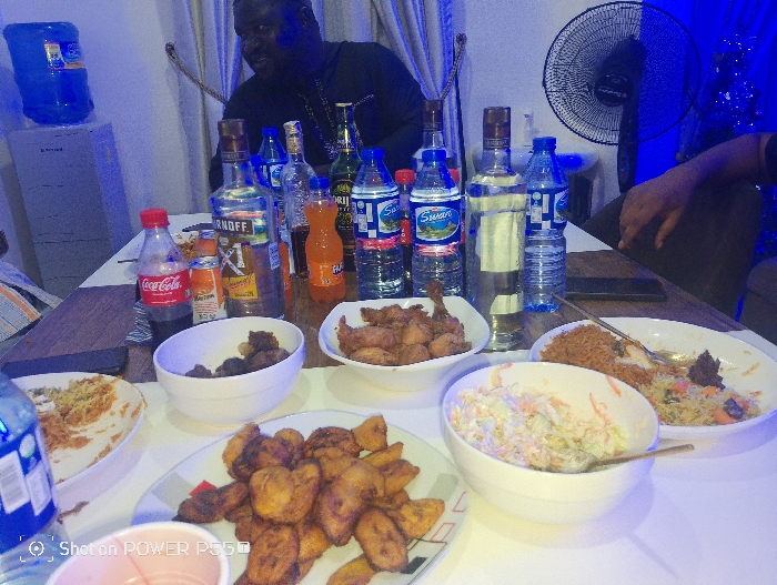 A white table is crowded with food and beverages. Plates hold plantain, fried chicken, jollof rice, and coleslaw. Bowls contain beef and other unidentified items. Several bottles of Smirnoff vodka, Swan water, Fanta, Coca-Cola, and another dark liquor bottle sit amidst the dishes. A person is visible to the left, and another person's arm is on the right. A fan is in the background, and a water dispenser.
