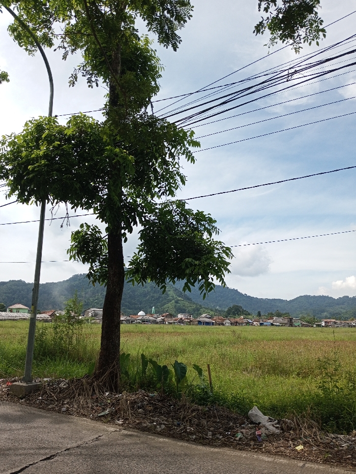 This daytime image depicts a semi-rural landscape within the city of Kandenuwara, Sri Lanka, under a bright blue sky with scattered white clouds. In the foreground, a cracked asphalt road runs along the bottom, adjacent to a dirt shoulder populated with dry leaves, natural debris, and scattered plastic waste. A tall, gray metal lamppost stands on the left, positioned beside a prominent tree featuring dark bark, exposed roots at its base, and dense green foliage. Beyond the immediate roadside, an extensive field of mixed green and brown grasses stretches towards a discernible settlement in the mid-ground. This settlement includes various buildings with assorted roof colors, notably featuring a white mosque with a dome and a light green minaret. The background is dominated by a range of green, tree-covered mountains. Numerous black utility lines are visible crisscrossing the upper sky, some interacting with the tree's canopy. No individuals or active subjects are present in the scene.