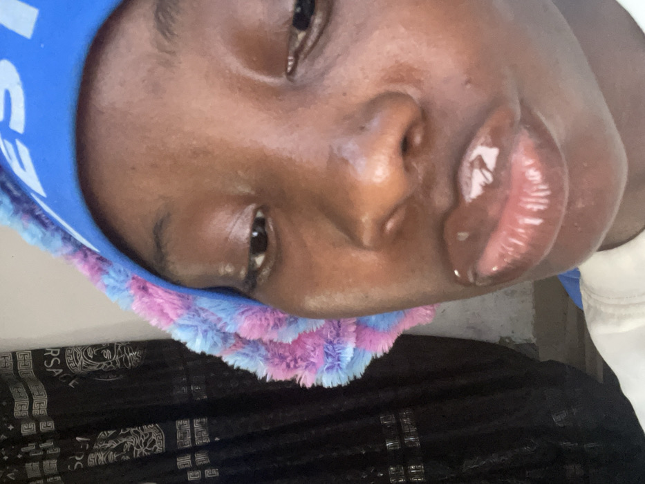 A close-up portrait shows an individual with dark skin, positioned slightly off-center and angled towards the camera. The subject is wearing a blue head covering with partially visible white lettering (appearing as "ES"), topped by a fluffy, textured fabric in shades of pink, blue, and purple. The individual's lips are slightly pouted and glossy, while the eyes are partially closed or cast downwards. A segment of a white garment is visible at the bottom of the frame. The background on the left consists of a dark curtain featuring a repeating pattern that includes Greek key motifs and reversed text, which appears to be "VERSACE". Adjacent to the curtain, a plain, light-colored wall is visible. The specific location within Lokoja, Nigeria, cannot be determined from the visual information presented.