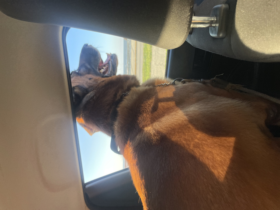 - "A reddish-brown dog is positioned in the rear passenger compartment of a vehicle, looking out a lowered window" by FM-ckPo02, licensed under CC BY 4.0