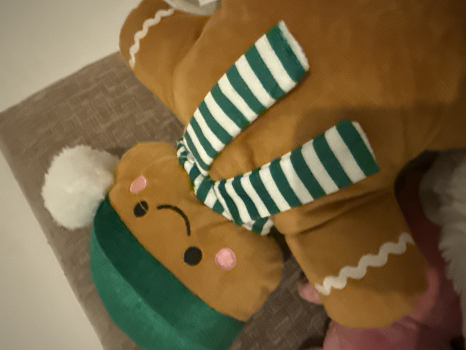 - "A plush gingerbread man toy is depicted resting on a textured, light brown or beige fabric surface" by FM-0S1qk2, licensed under CC BY 4.0