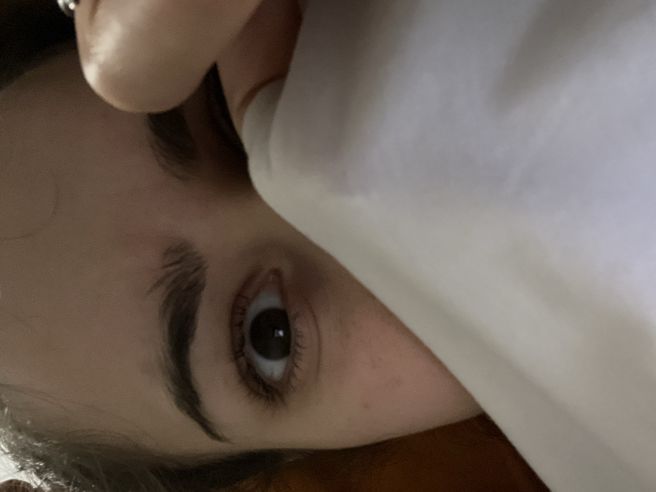 A close-up photograph captures a human subject's upper face, partially obscured by a white fabric. The subject's left eye (viewer's left) is clearly visible, open wide with a dilated pupil that reflects a singular point of light. The left eyebrow, a portion of the forehead, and the upper left cheek are also discernible. Dark hair is visible along the upper left edge of the frame. A right hand, adorned with a silver-colored ring on a finger, is positioned on the upper right, appearing to manipulate the white fabric which covers the lower portion of the subject's face. The background is indistinct and dark, with a blurred reddish-brown element visible behind the subject's head on the left side. The scene suggests an indoor environment with dim illumination. There are no identifiable geographical markers or architectural features within the image to determine a specific location in Sofia, Bulgaria, or any other city.