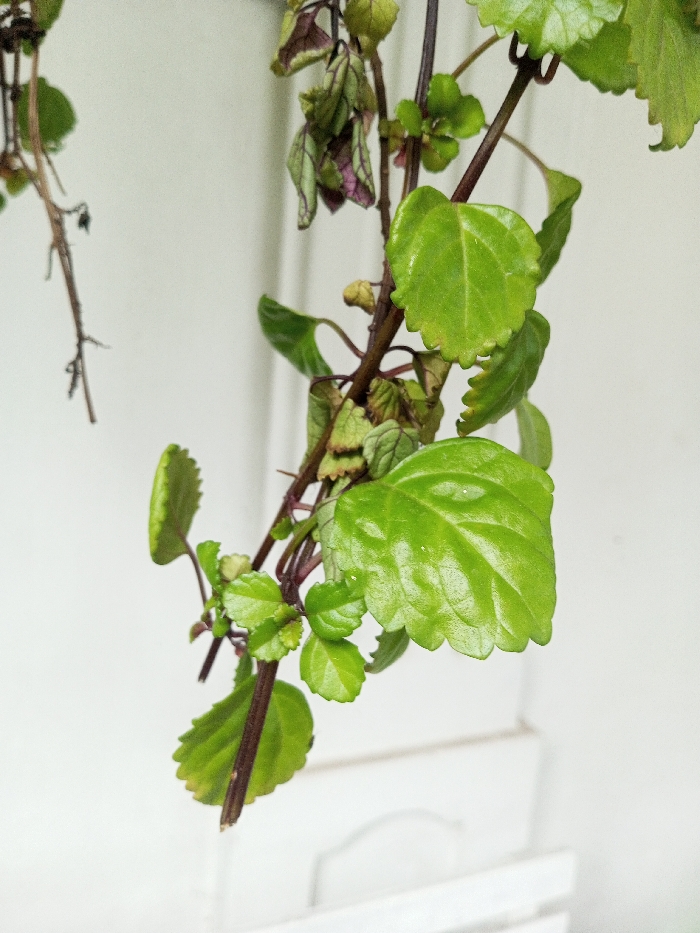 The image depicts a close-up of a trailing plant, located in the city of Khammam, India. Multiple slender, dark reddish-brown stems descend, adorned with numerous ovate leaves featuring crenate margins. Leaf coloration ranges from vibrant light green, particularly on newer growth, to duller green and desiccated reddish-purple on older or stressed foliage. Several leaves exhibit a slight surface sheen. The plant is positioned against a plain, light off-white background. A white, horizontal architectural element, possibly a window frame or molding, is partially visible at the bottom right. No people are present, and no actions or interactions are occurring.