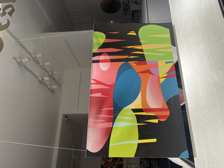 An abstract painting with bold shapes of red, blue, green, orange, and yellow dominates the view. These elements are set against a black background. The artwork appears to be displayed in a gallery or commercial space. A white wall with track lighting is visible on the left. Light-colored floor tiles are on the right. A thin, transparent material crosses horizontally across the image.