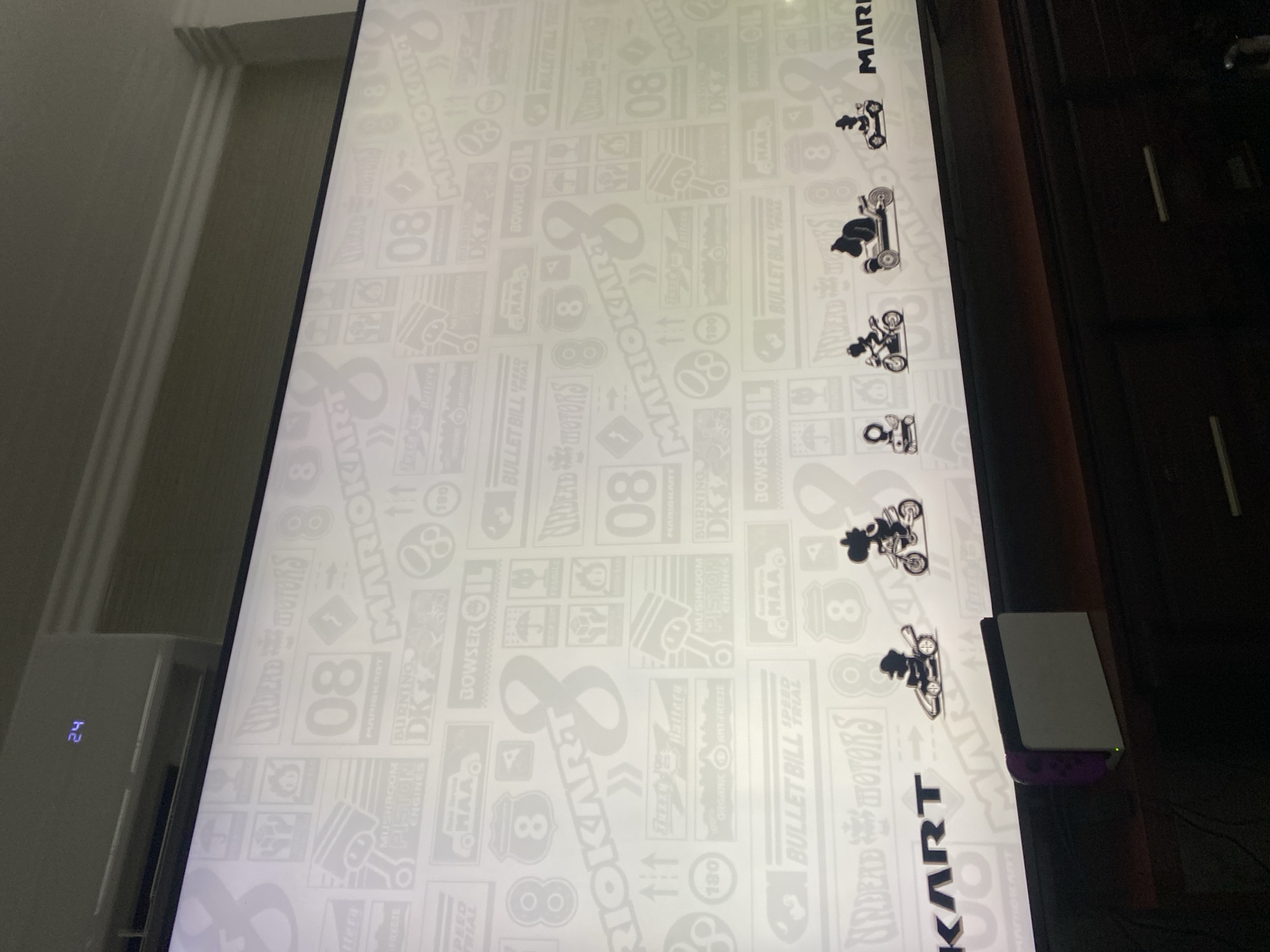 The image depicts a large display featuring a repeating "Mario Kart 8" themed wallpaper
