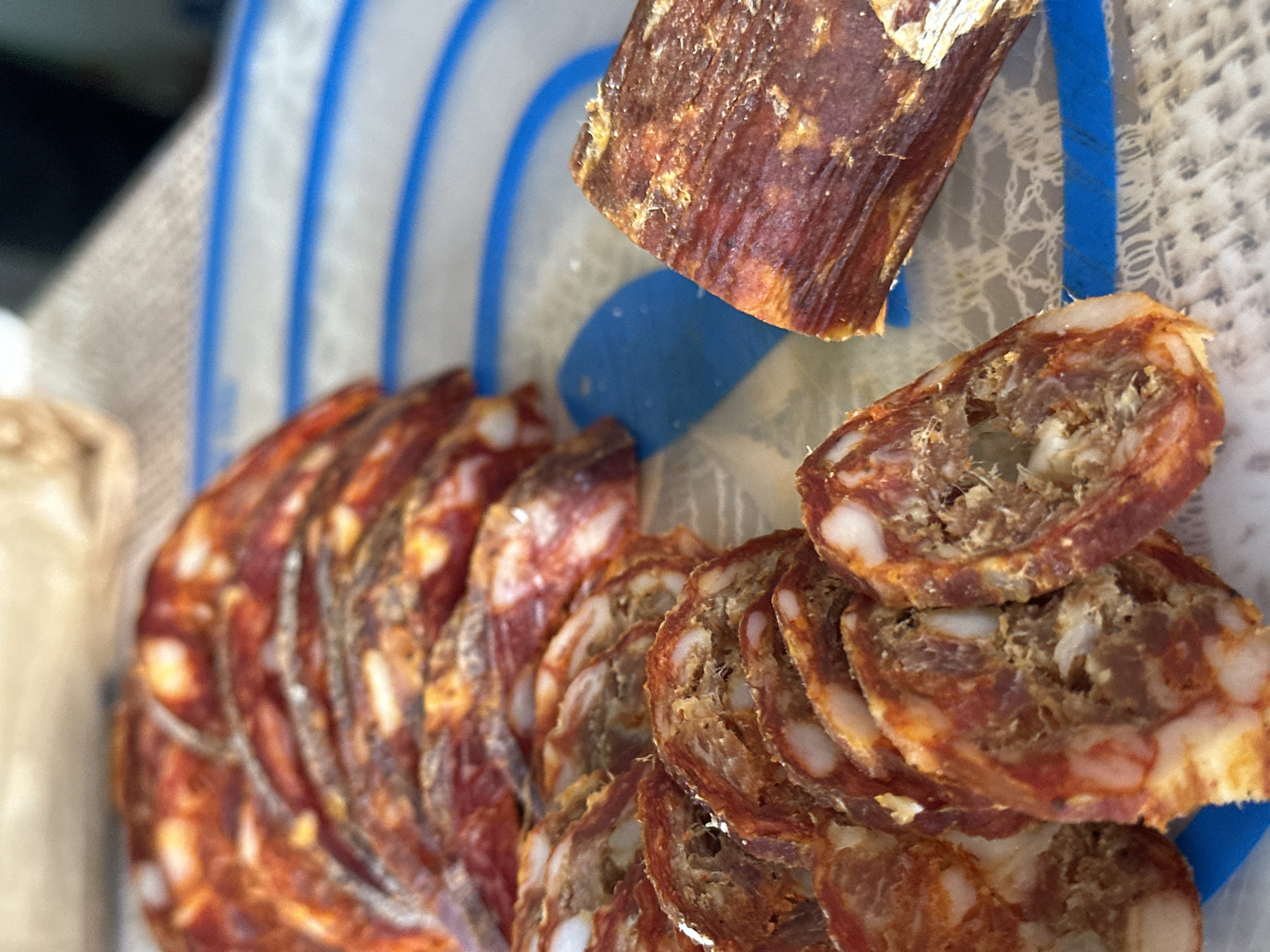 - "A close-up photograph displays several slices of dry cured sausage arranged on a cutting board, possibly in a kitchen or food preparation area" by FM-0yL5L2, licensed under CC BY 4.0