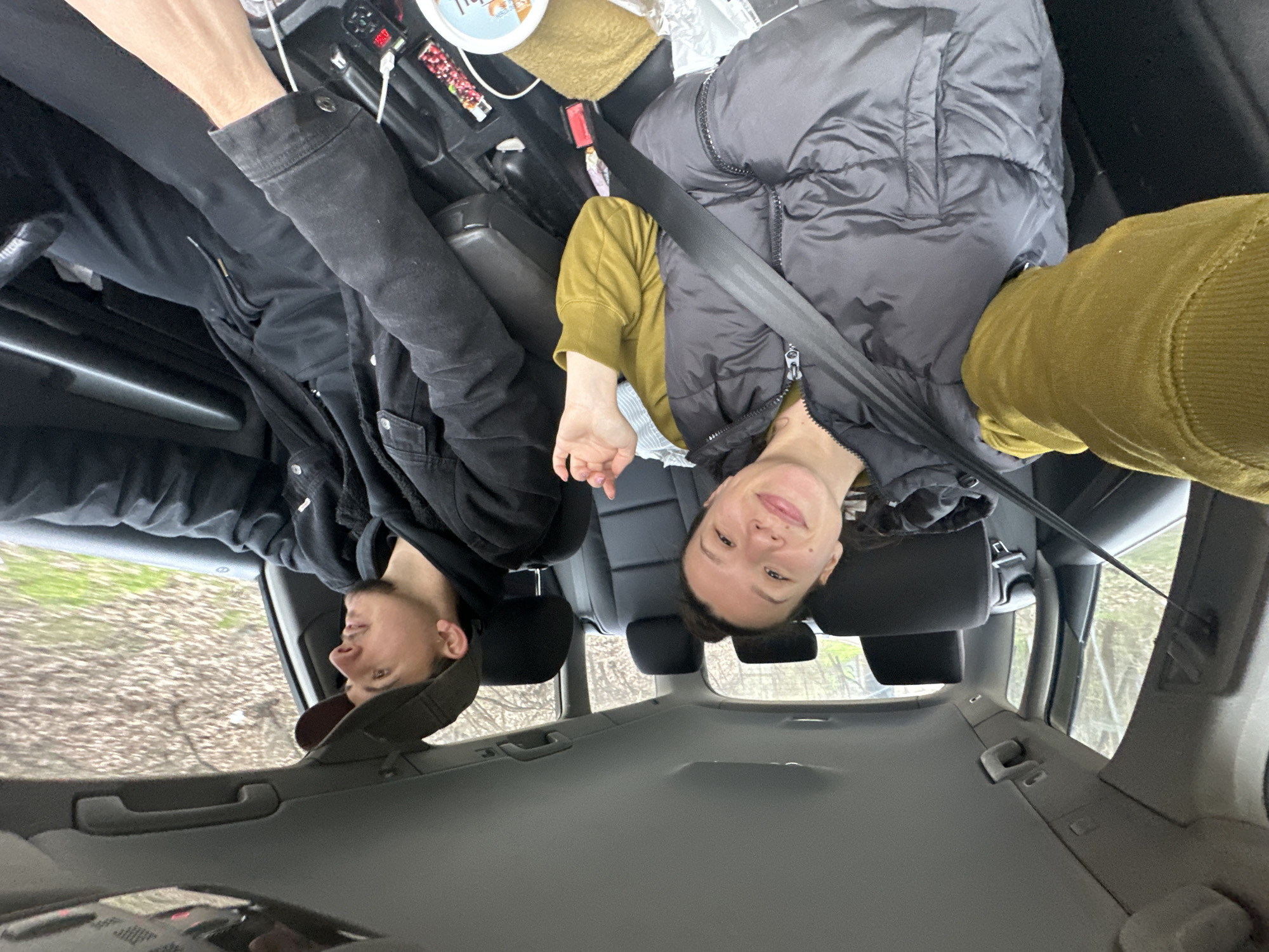 Two people are in a car, facing the camera, which is upside down
