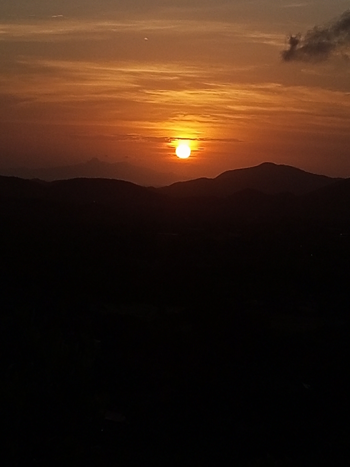 A vibrant sunset illuminates the sky with orange and yellow hues, streaked with wispy clouds. A bright sun sits on the horizon line, partially obscured by silhouetted mountain ranges. The foreground is a dark, undefined mass of land, suggesting a valley or lower elevation. A single, isolated cloud is visible in the upper right corner of the sky.