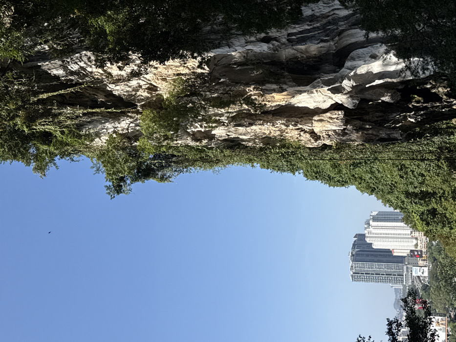 A landscape view presents a clear blue sky above. Below, a rock cliff face extends across the top, lined with trees. A cluster of modern high-rise buildings is visible in the lower right. The perspective is tilted, with the sky dominating the scene. Vegetation frames both the top and right sides, contrasting the natural rock with the urban architecture.
