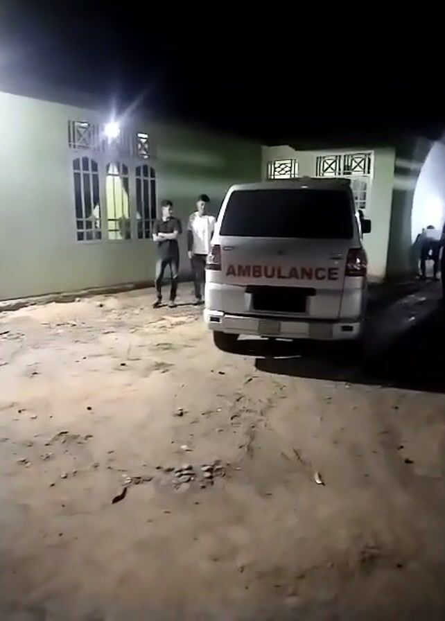 The video depicts a nighttime scene with an ambulance parked in a dirt lot outside a light green building. Two men are standing near the ambulance, while other individuals are visible in the background. The word "AMBULANCE" is prominently displayed on the back of the vehicle. The area is illuminated by artificial lights, and the overall atmosphere appears somber.