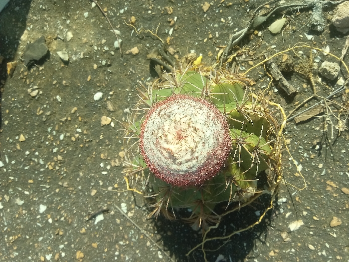 An overhead view captures a single cactus positioned on dark, uneven ground in Juan Griego, Venezuela. The cactus, approximately 15-20 cm in diameter, is globular with a green, ribbed body featuring prominent, light-colored spines arranged in clusters along the ridges. The apex of the cactus displays a distinctive, circular, flattened structure, approximately 8-10 cm in diameter, characterized by dense, short, reddish-brown and white bristly material forming concentric rings; the center of this structure appears lighter, possibly cream or pale yellow. The ground surrounding the cactus is composed of dark soil or compacted earth, liberally mixed with small, light-colored pebbles and scattered debris including dry plant matter and thin, wiry root fragments. Direct sunlight illuminates the scene from an elevated position, casting a distinct shadow of the cactus onto the ground towards the bottom right quadrant of the image. No other subjects, individuals, or structures are visible.