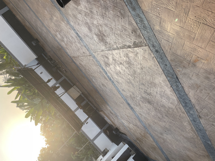 The scene, located in Ogbunu, Nigeria, depicts an outdoor area under direct sunlight, with a pronounced diagonal tilt. The foreground features an expansive, patterned concrete surface primarily in shades of light brown and tan. This surface is segmented by dark grey strips, creating distinct rectangular and square sections. These sections exhibit various embossed textures, including simulated wood grain, geometric patterns, and pebble-like designs. To the right, a low wall or fence with a white upper section and a dark grey base runs parallel to the patterned ground. Above this wall, a dark, potentially corrugated metal or thatched awning extends over a portion of the structure. Behind this wall and awning, dense green tropical foliage, identifiable as large banana leaves, is visible. In the background, further structures or buildings with white and dark sections are partially discernible. The sun, positioned in the upper right, casts significant glare and bright illumination across the scene. A black cylindrical object is partially visible in the lower left corner. No human figures are present.