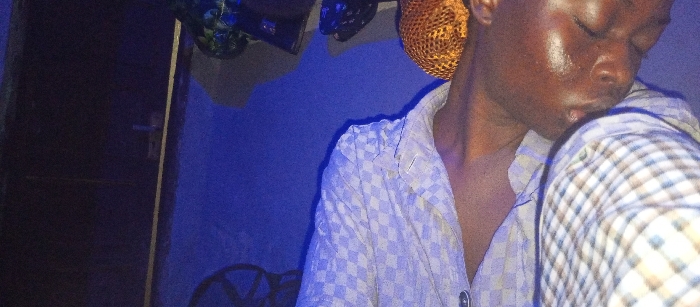 The scene depicts an individual inside a dimly lit room with a pervasive blue light cast. The subject, an individual with dark skin, is visible from the chest upwards, positioned on the right side of the frame. They are wearing a light-colored, short-sleeved shirt with a subtle checkerboard pattern. A second, plaid shirt (brown, white, and blue tones) is draped over their right shoulder, partially obscuring the front of their body. A golden-orange, woven or mesh-like head covering is on their head. The individual's eyes are closed, and their face appears moist or shiny. Their head is tilted downwards and to the right. The background features a plain, vibrant blue wall. To the left, a dark-colored door with a metallic handle and a light-colored vertical trim is partially visible. Above the door, several indistinct dark objects, possibly clothing or decor, are present. The specific location within the city of Abuja, Nigeria, is not discernible from the visual content of the image.