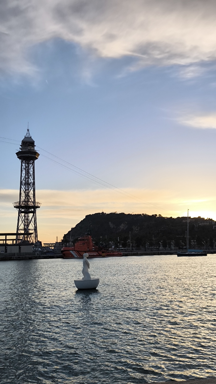 A waterfront view at dusk features a tall metal tower on the left, connected by cables. In the foreground, a white sculpture sits on a small boat in the water. A red and orange coast guard vessel is docked behind the sculpture. A low-lying mountain or hill dominates the background, with the setting sun casting a golden glow on the sky and water.