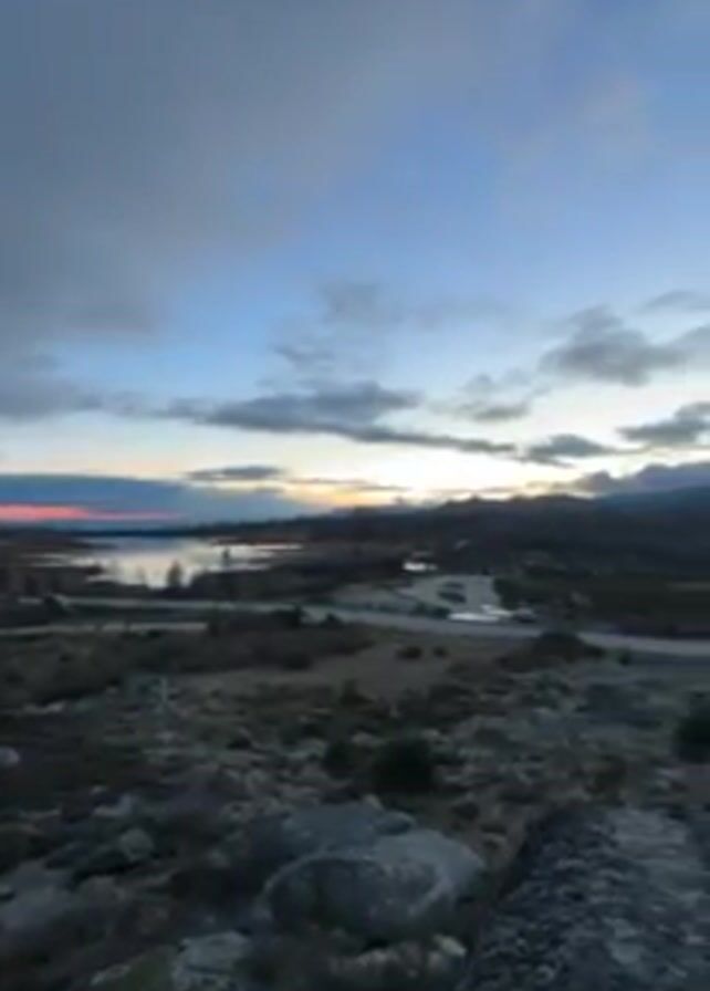 landscape at twilight. The foreground is rocky and covered with low-lying vegetation. In the distance, there's a body of water reflecting the dim light of the setting sun. The sky is filled with clouds, ranging from dark gray to light blue, with hints of orange and yellow near the horizon. A road can be seen winding through the landscape. The overall scene is quiet and still.