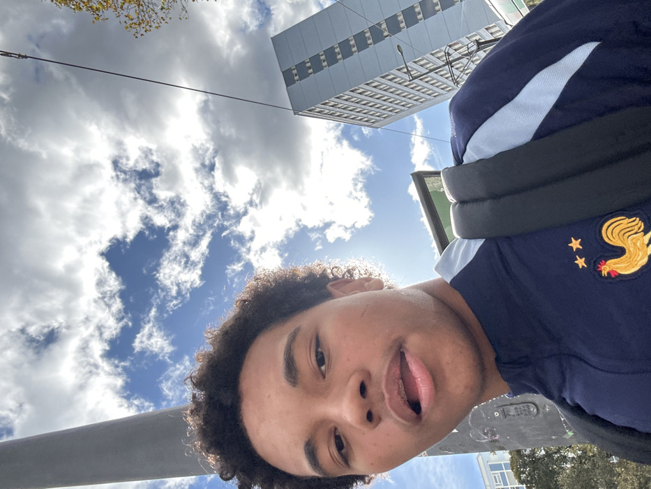A young male individual, with curly dark hair and light brown complexion, is depicted in a close-up, low-angle, outdoor shot. He has a small scar visible on his right cheekbone and his mouth is slightly ajar with his tongue visible. He wears a navy blue tracksuit jacket featuring light blue panels on the shoulders and an embroidered emblem on the left chest consisting of a golden Gallic rooster with two gold stars above it, representing the French Football Federation. A black backpack strap is visible over his right shoulder. The background consists of a bright blue sky with scattered white cumulus clouds. To the left, a thick, light gray utility pole extends upwards. To the right, a tall, light blue or pale gray-blue multi-story residential building, identified as the Tour de l'Esplanade, rises prominently. Overhead power or communication lines crisscross the upper right portion of the frame. Yellowing autumn foliage is partially visible on the far right edge. A green and dark structure, possibly a public transport shelter, is faintly visible behind the subject's right shoulder. The scene is illuminated by direct sunlight, casting bright highlights on the subject's hair. The presence of the Tour de l'Esplanade precisely locates this scene in the Esplanade district of Strasbourg, France.