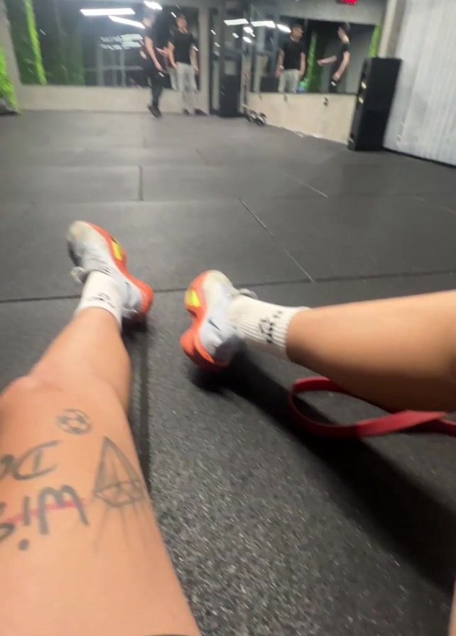 person sitting on the floor of a gym, legs extended in front of them, with a red resistance band lying nearby. The person is wearing blue shorts, white socks, and sneakers. Their leg has a tattoo. In the background, there are other people working out, as well as various pieces of gym equipment, including a punching bag, plyo boxes, a dumbbell, and step risers. The gym has black rubber flooring and mirrored walls.