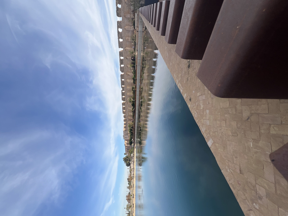 An outdoor, wide-angle image captures a historical landscape in Al Machouar – Stinia, Morocco, under a bright, partly cloudy blue sky. The scene is dominated by a large, rectangular body of calm, blue-green water reflecting the sky and background structures. In the immediate foreground, to the right, a series of ten dark brown, rectangular, bench-like structures or bollards are arranged linearly, receding into the distance along the water's edge. A light brown, patterned brick pathway, laid in a herringbone style, runs parallel to the water on its right side, extending from the lower left towards the upper right. Across the water, a long, ancient light-brown stone wall with a crenellated top, featuring numerous evenly spaced arched openings, stretches horizontally across the midground. Sparse green foliage, including trees and shrubs, is visible along the base of this wall and slightly behind it. Distant, light-colored buildings are discernible behind the wall to the left. The sky, occupying the upper two-thirds of the image, is a vibrant blue with scattered, thin white cirrus clouds. No individuals are present in the frame.