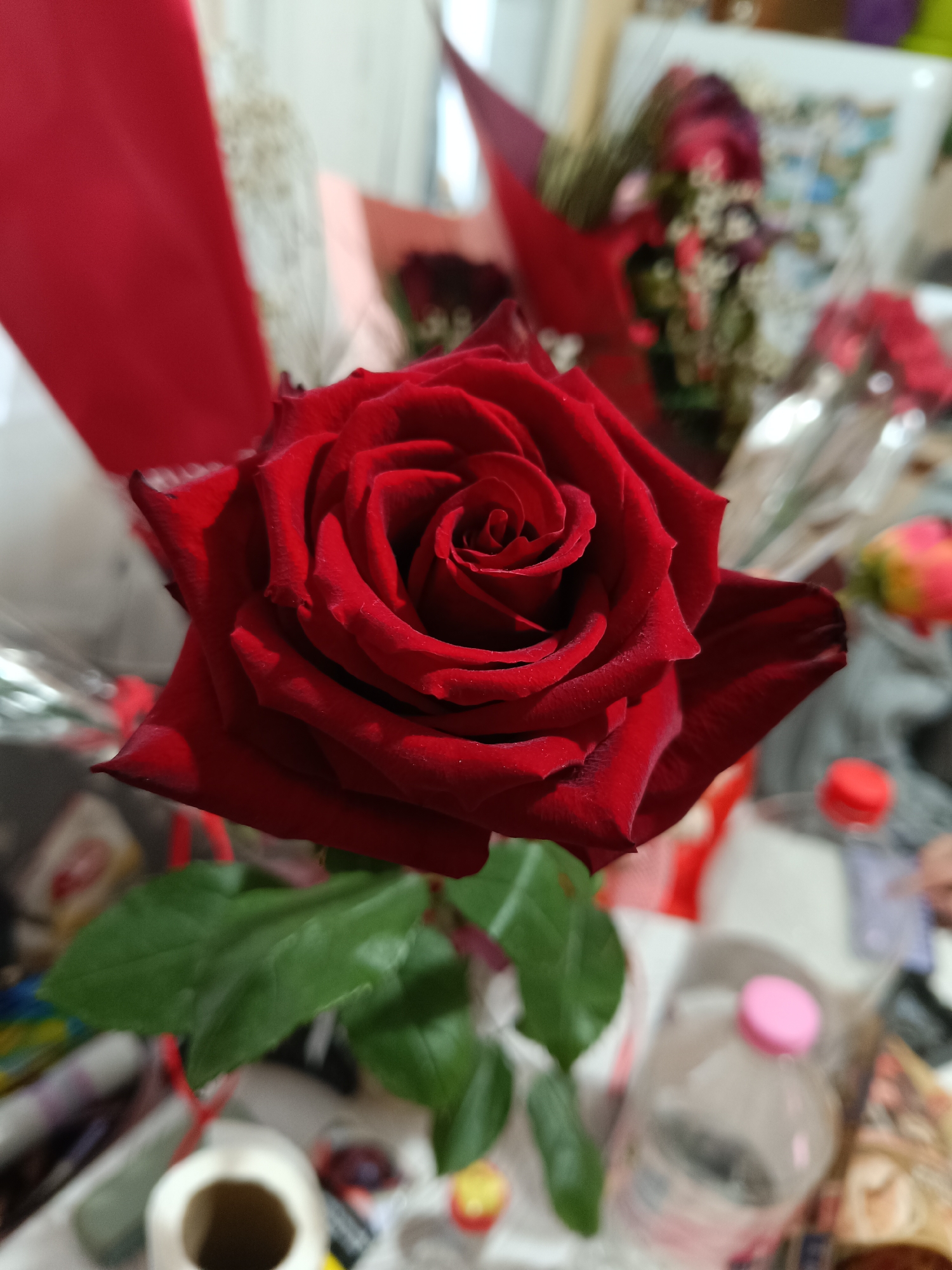 A close-up photograph depicts a single, fully bloomed dark red rose in sharp focus, centered prominently in the frame. The rose exhibits numerous tightly packed petals, showcasing a velvet-like texture with varying shades of deep crimson. Green leaves are visible on the stem directly beneath the rose. The background is extensively blurred, suggesting an indoor environment with multiple other objects. To the left and upper-left, blurred red wrapping material is discernible, likely part of another bouquet. In the upper-right and mid-right, several indistinct bouquets of flowers, wrapped in clear plastic and red paper, are present. The lower foreground includes blurred household items such as plastic bottles, one with a pink cap and another with a red cap, and a white cylindrical paper roll. No individuals are visible. The scene is situated in an unspecified indoor location within Shumen, Bulgaria.